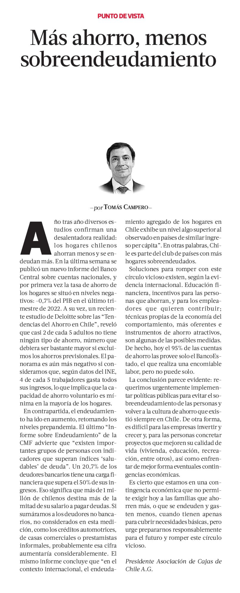 Lee el detalle de su planteamiento en la columna «Más ahorro, menos sobreendeudamiento», publicada hoy en LT Pulso y disponible en este enlace